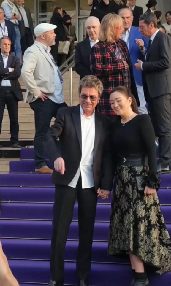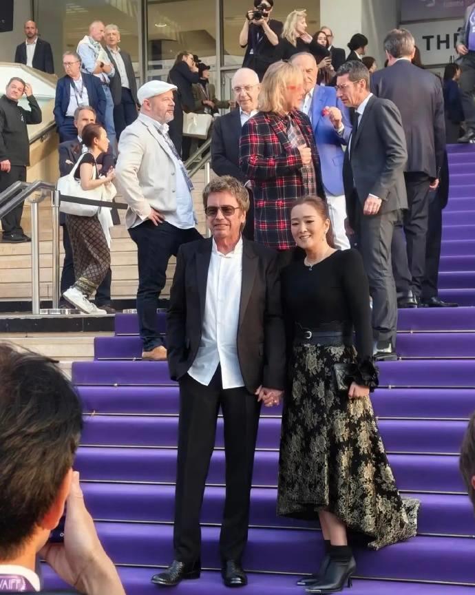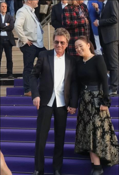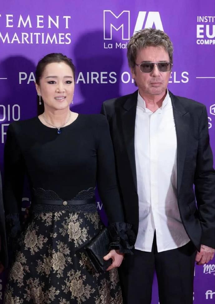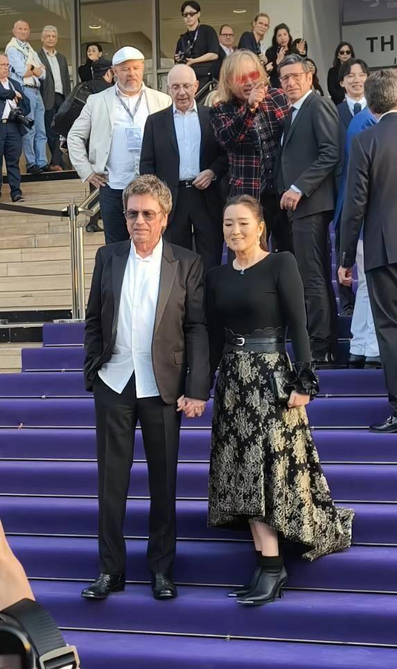 而比女王气场更抢镜的,是她与77岁丈夫让·米歇尔·雅尔的甜蜜互动。两人全程十指紧扣,面对外媒镜头毫不避讳。巩俐微微露出笑容,还特意将头偏向丈夫一侧,难得流露出小女人的依恋姿态。她的丈夫雅尔身着深色西装,身姿挺拔,两人并肩而立,亲昵互动尽显多年默契。