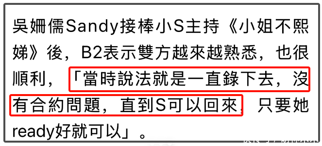 B2接受媒体采访也透露他和小S有联系,小S偶尔会问收视率,但似乎没有复工打算,而B2和吴姗儒约定的就是一直录到小S回归,没有合约限制,看来B2似乎也做好了小S长期不回归的准备。