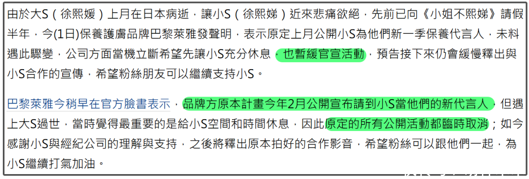 据悉,本来小S今年2月份就官宣了一个代言,按理来说后续应该配合各种宣传出镜,但由于大S骤逝,小S也无心工作,代言的宣传全面停滞。